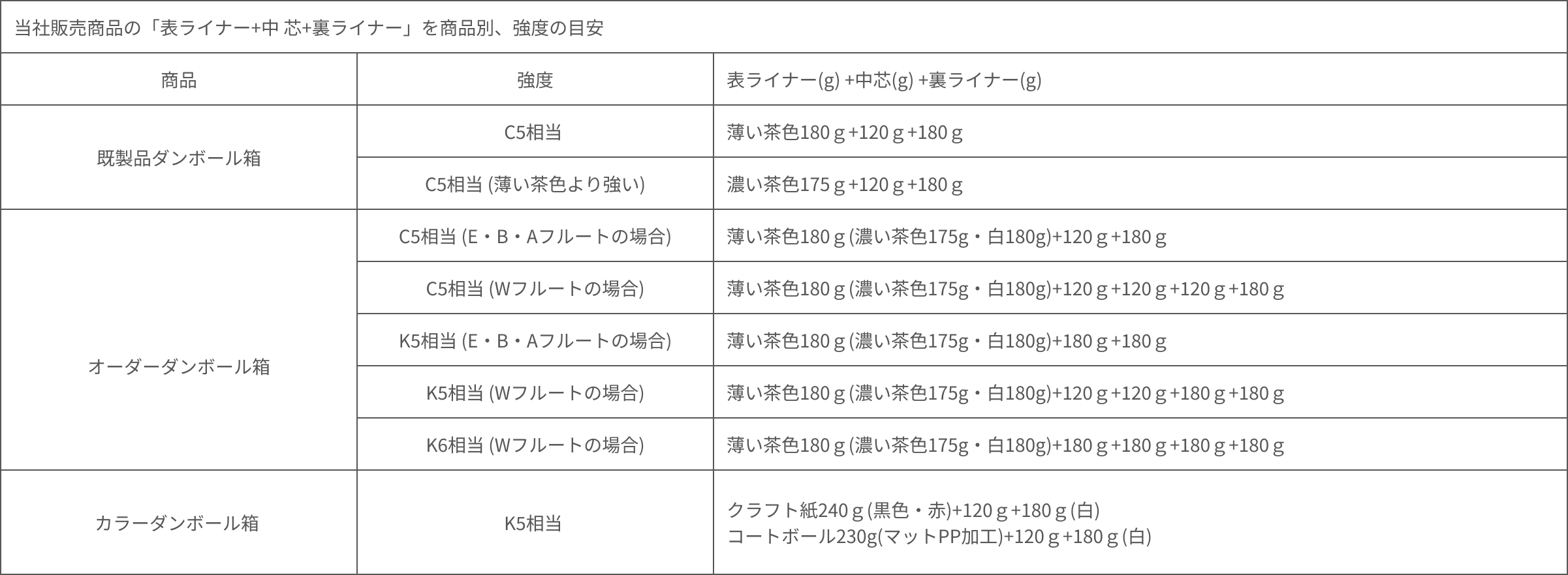 段ボール箱の強度はその厚みと中芯の組み合わせにより決まります。