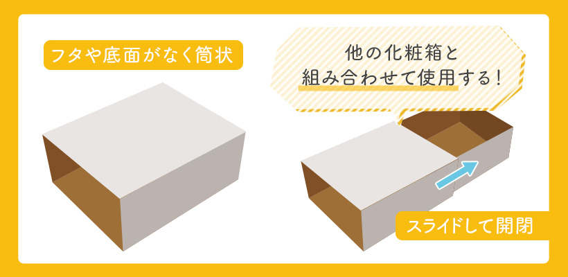 スリーブ箱は、フタや底面のない筒状の「スリーブ」に、組み立て式の「身箱」を嵌め込み、スライドさせて開閉する形状の化粧箱です。スリーブ箱は、商品に直接かぶせたり他の化粧箱と組み合わせたりして、使用することもあります。