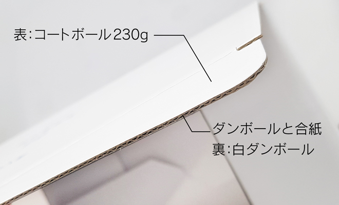 美粧箱は基本コートボール230gを使用しております。ダンボールはE/F(1.5mm)・B/F(3mm)まで選択可能です。